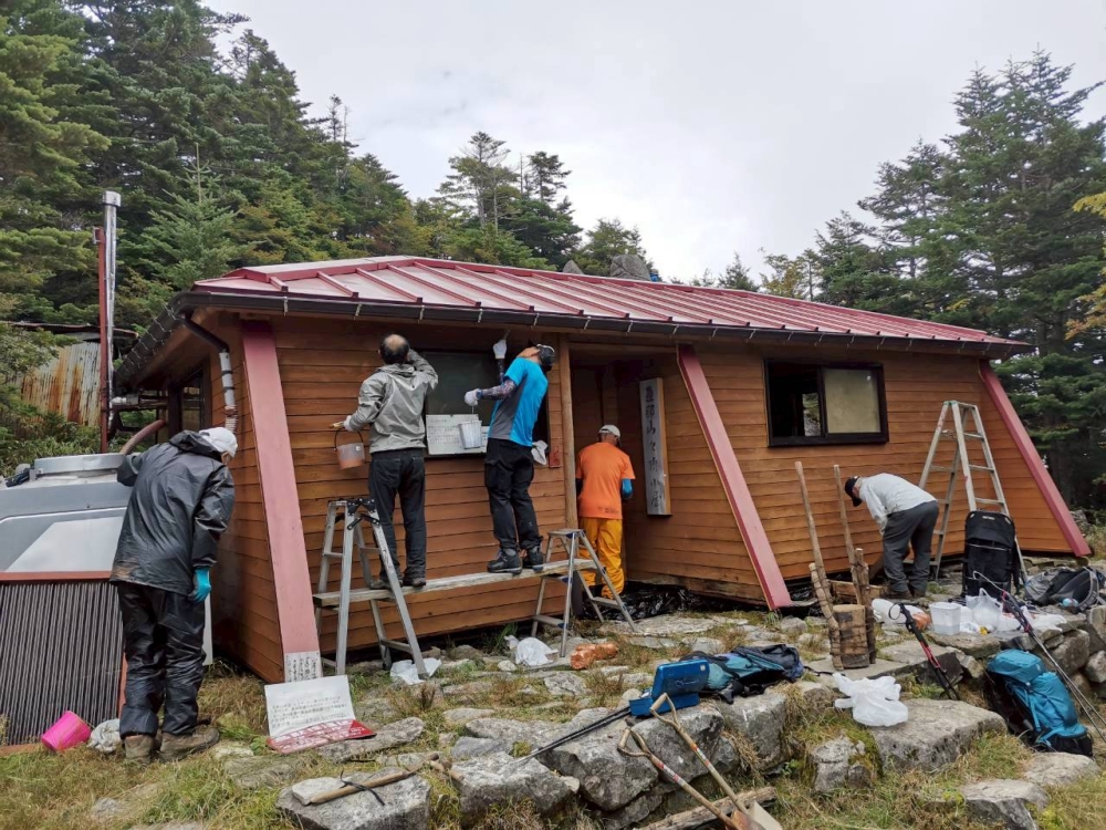 恵那山 頂上小屋 外壁塗装および小屋の掃除を 9月22日 23日と2日間にわたり行いました。